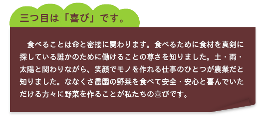 - 旬の野菜は「夏はカラダを冷やす」、「冬はカラダを温める」等、四季折々に人間が求めるミネラルを補給できる役割を持っています。野菜を食すことは疫学研究的にも健康に対して良いことだと言われております。私たちは、野菜の魅力を引き出す、お客様に喜ばれる野菜を生産することに磨きをかけていきます。