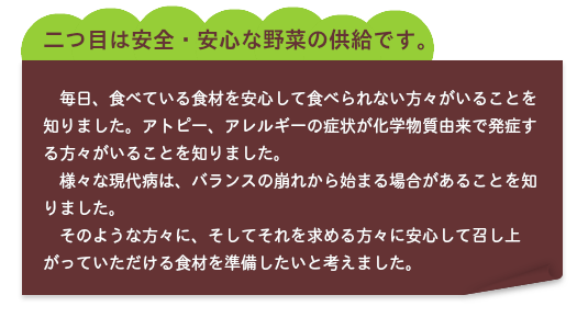 私たちは、この農法を忠実に行うことで、安心安全で美味しい野菜の供給を目指すことにこだわりを持って取り組んでおります。